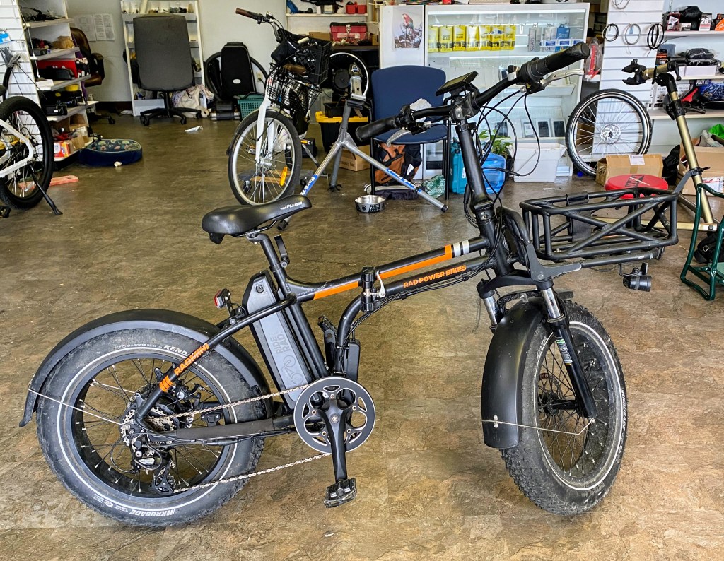 A pair of well loved RadPower bikes came in today, a 2019 Radwagon and a fat tired RadRover, a stump jumpin’ all terrain bike. Both needed some brake work, but no new pads needed. I had to clean the chain.twice, it looked like they had spent some time at the beach.