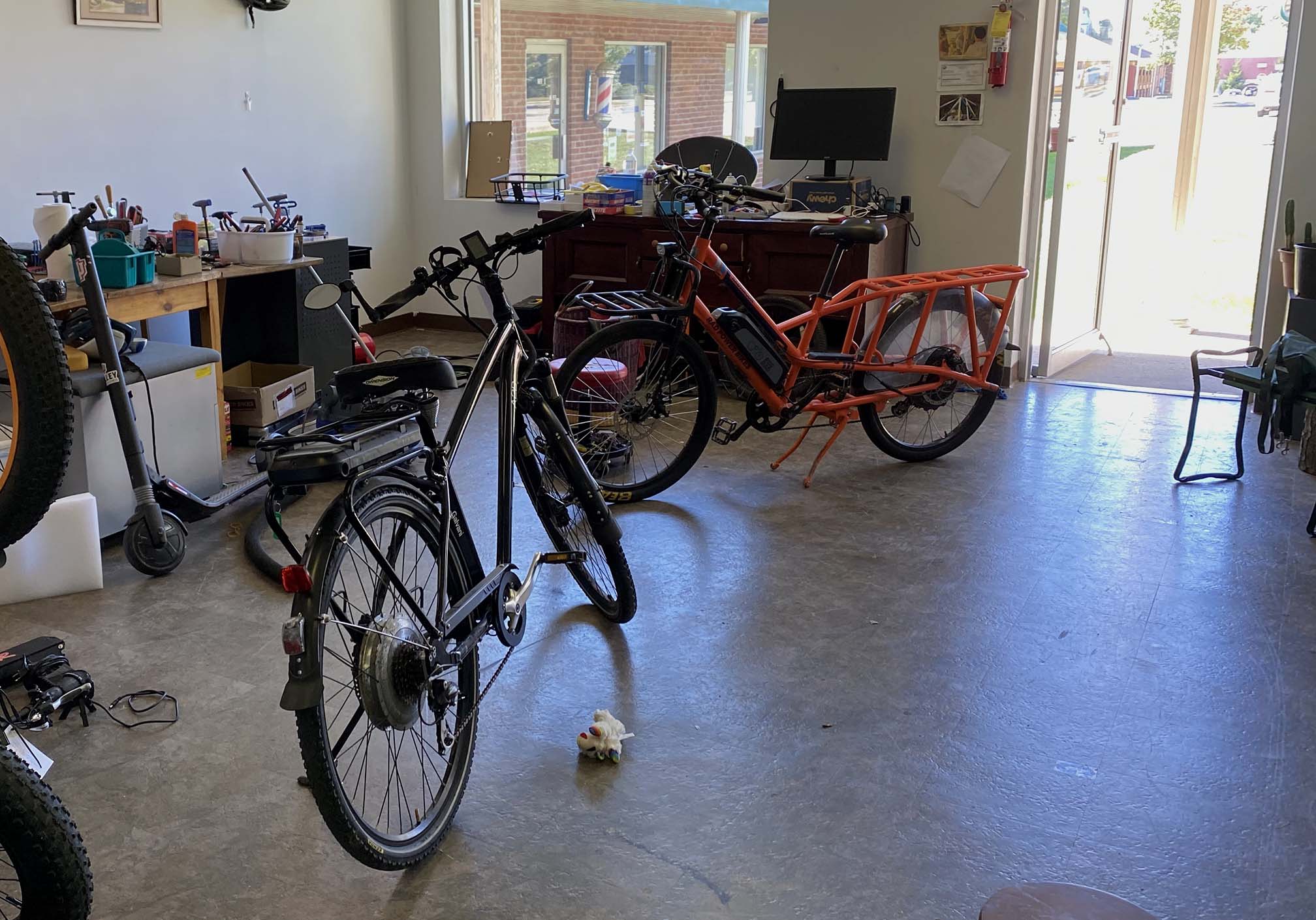 Radwagon (2019) in for a tune-up, adjust brakes and clean drive chain.Cool way to lock a Rad battery in place, even with a lock pick, it won’t come off.Fat tire ready for any terrain