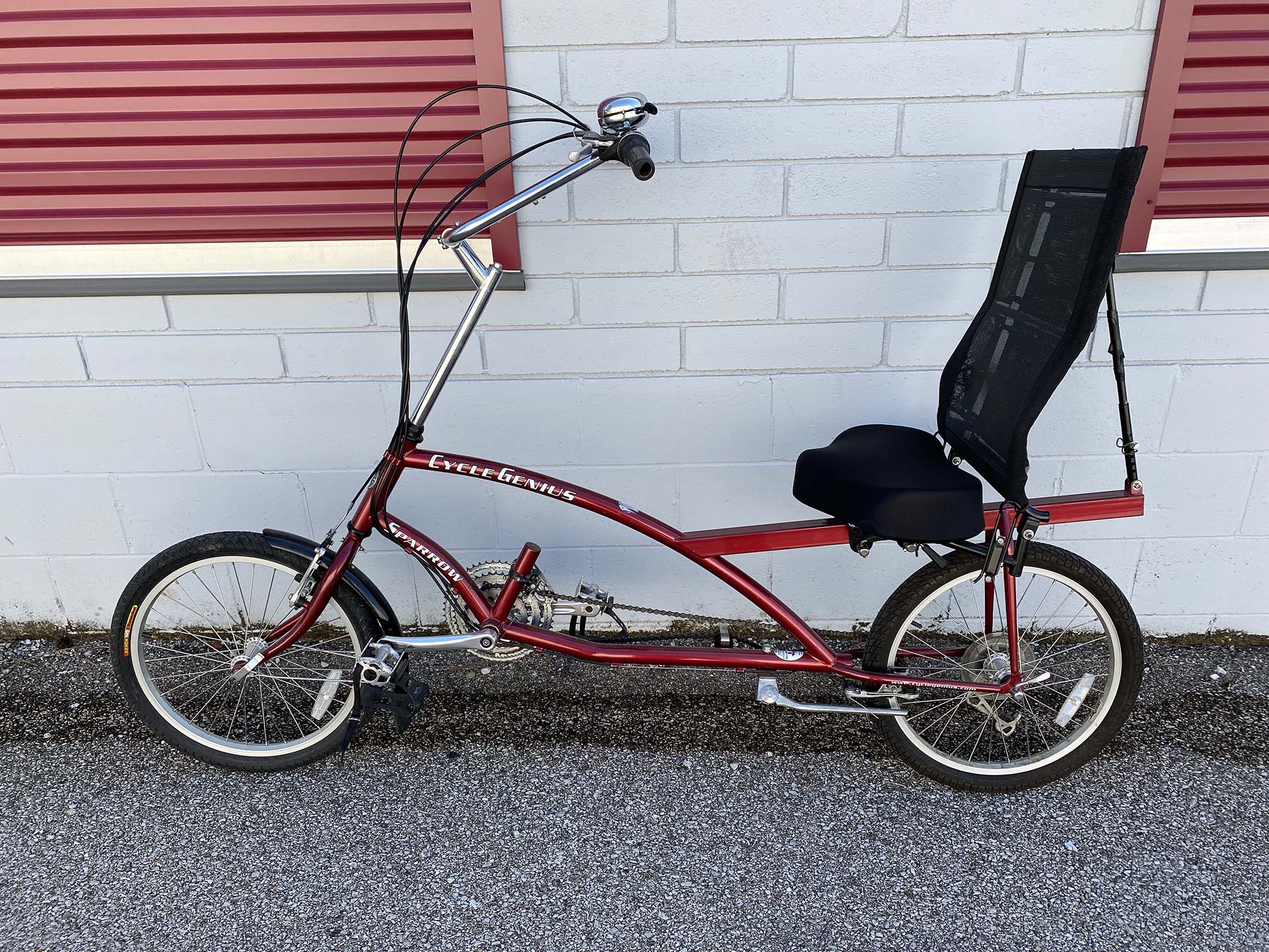 If you are interested in the recumbent style of bike, I have this Cycle Genius in the shop, 20″ wheels and super comfy seat, $650.
