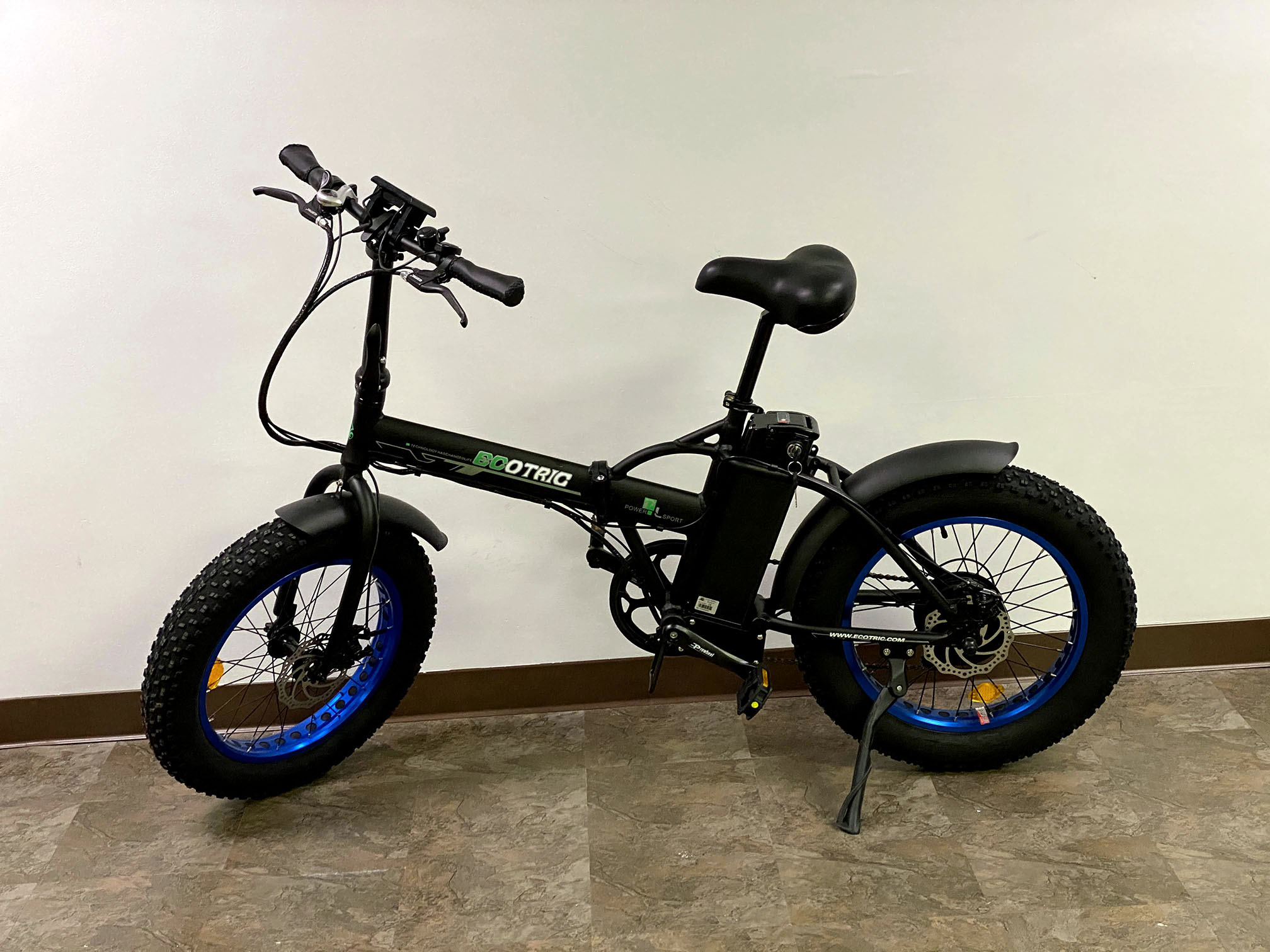 The Fold XS is the premium version of the Fold X, and is a beast of a machine, ready to hold a 300 pound person and still zip up any hill in southern Indiana. It sports a 750Watt continuous (1000Watt peak) motor, and a 14 Ah 48V battery, so the Fold XS can go the distance. With 4″ fat tires, a suspension fork and a suspension dropper seat, this e-bike smoothes out the bumps in the back country, or the potholes in the city streets! The hydraulic disk brakes with 180mm rotor offer best in class braking power for this heavy duty bike. The 20″ x 4″ tires allow both maneuverability and great traction, while allowing for more torque from the motor, so you have to be careful not to pull a wheelie when starting up!