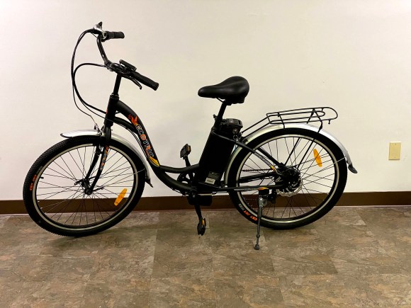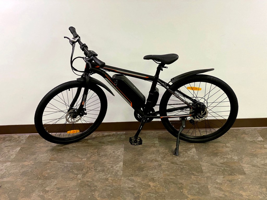 It is really solid, well designed, with plenty of power and pickup, perfect for navigating Bloomington in style. It has a 48V/500W motor, and a big 14 Ah battery, meaning it can go up to 40 miles on a charge. It sports a hydraulic front fork for off-road fun, and the luxury of hydaulic disk brakes. It came installed with a rear rack, and panniers will make it perfect for shopping, work or picnics.