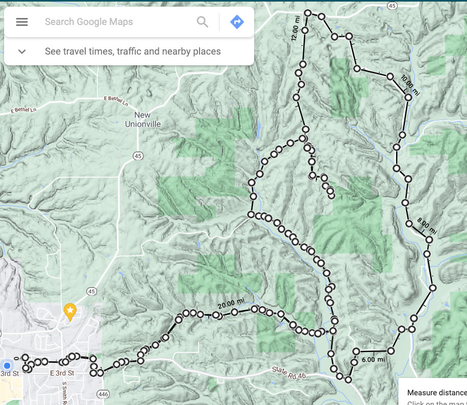 Over the past 15 years, Jojo, Charlie, and I have ridden on nearly every road in Monroe and Lawrence counties, but lately (due to health and age issues), we have not been riding as in the past. Instead we have been enjoying the city’s growing bike infrastructure and trails. But we missed those long treks through the county…